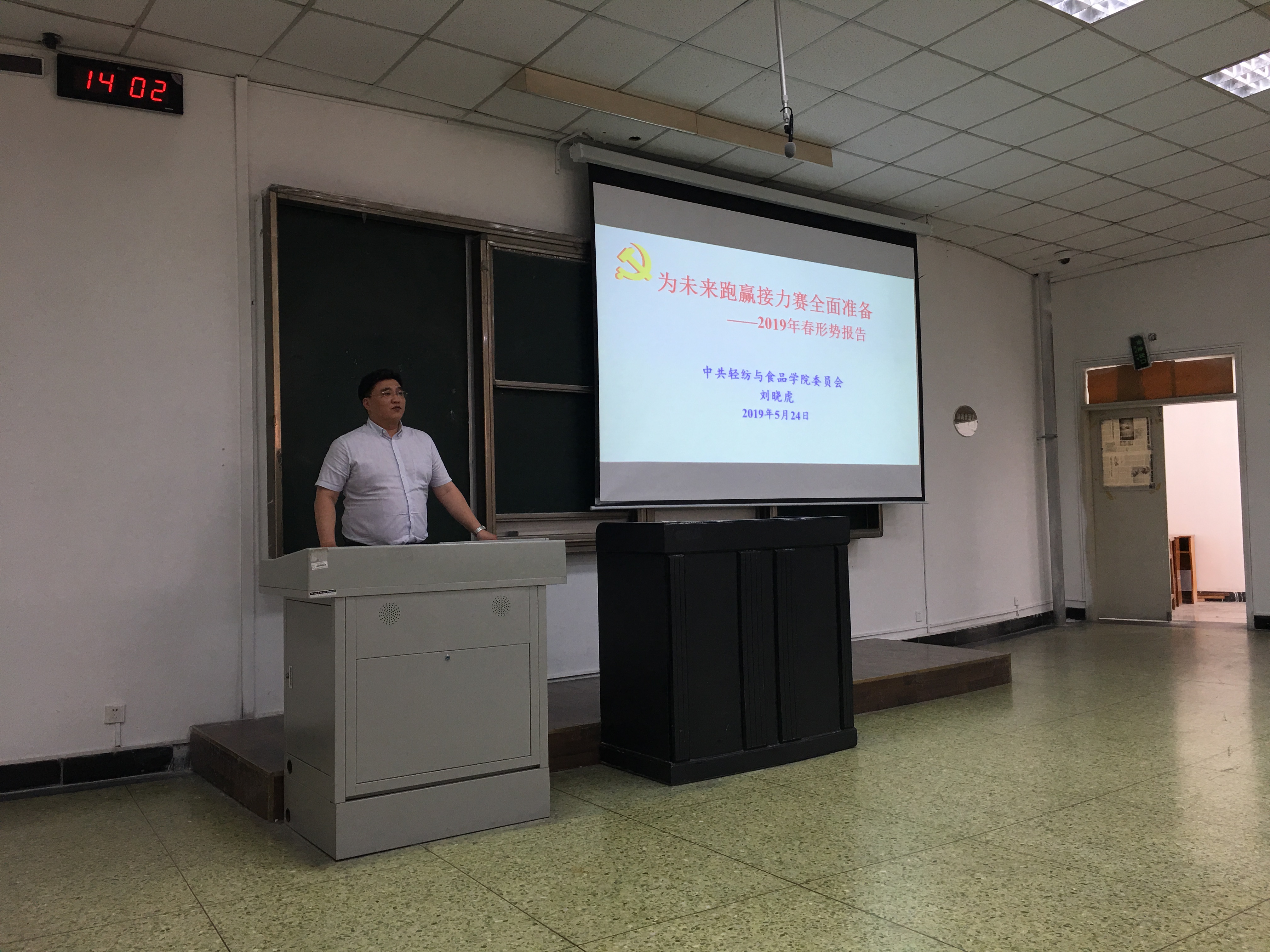 2019年5月24日下午,伟德体育官网党委书记刘晓虎副教授深入2016级本科生形势与政策课课堂,为2016级全体同学做了以“为未来跑赢接力赛全面准备”的主题形势报告会。辅导员王舒灏老师及2016级全体本科生听取了报告。