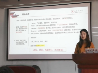 接下来,成功考取成都市紧急选调的刘玉梅同学讲解了公务员考试的形势、逻辑推理、法律法规和公文写作等重点考核内容,同时建议同学们保持备考时间的连续性。伍银环同学和李巧磊同学分别介绍了贵州和云南两地选调的相关政策,提醒报考同学们注意信息发布和报名表填写的完整性。龚川杰同学则分享了关于人才引进的面试技巧,注意礼仪和着装以及自我表达的清晰性等,并需提前对应聘岗位有一定程度的了解。