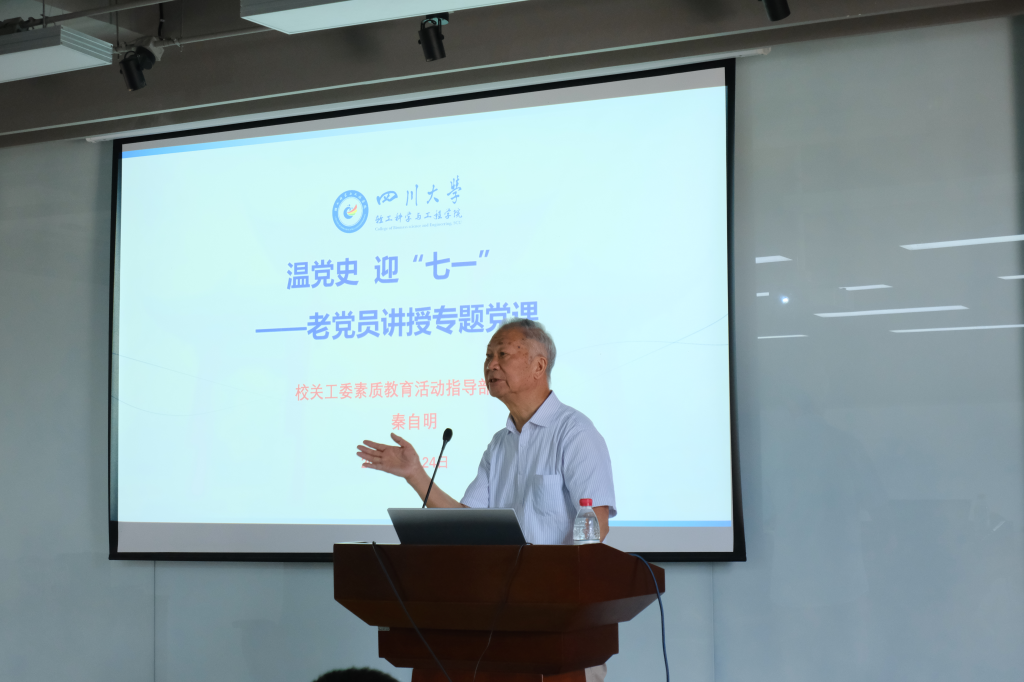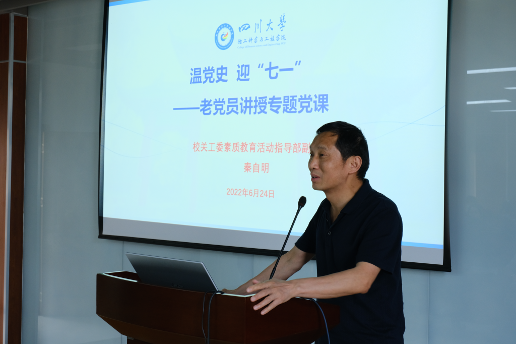 随后,秦自明老师进行了专题党课讲授。秦老师先从学习“四史”的重要性开篇,进而指出“四史”就是为人民谋幸福、为民族谋复兴、为世界谋大同的实践史,党的领导是“四史”的主线。通过学习“四史”,才能真真切切地了解中国共产党走过的峥嵘岁月,体会党在革命和奋斗中的艰难历程。其次,秦自明老师对本人学习党史的体会与大家进行了分享与交流,并围绕中国共产党的产生是历史的必然,坚定的理想信念是中国共产党取得胜利的精神支柱,人民群众的支持是中国共产党取得胜利的坚实基础,科学正确的指导思想是党事业发展的精神旗帜,自我革命、自我完善是党维持生机活力的法宝等五个方面进行详细阐述,深入浅出、获益匪浅。