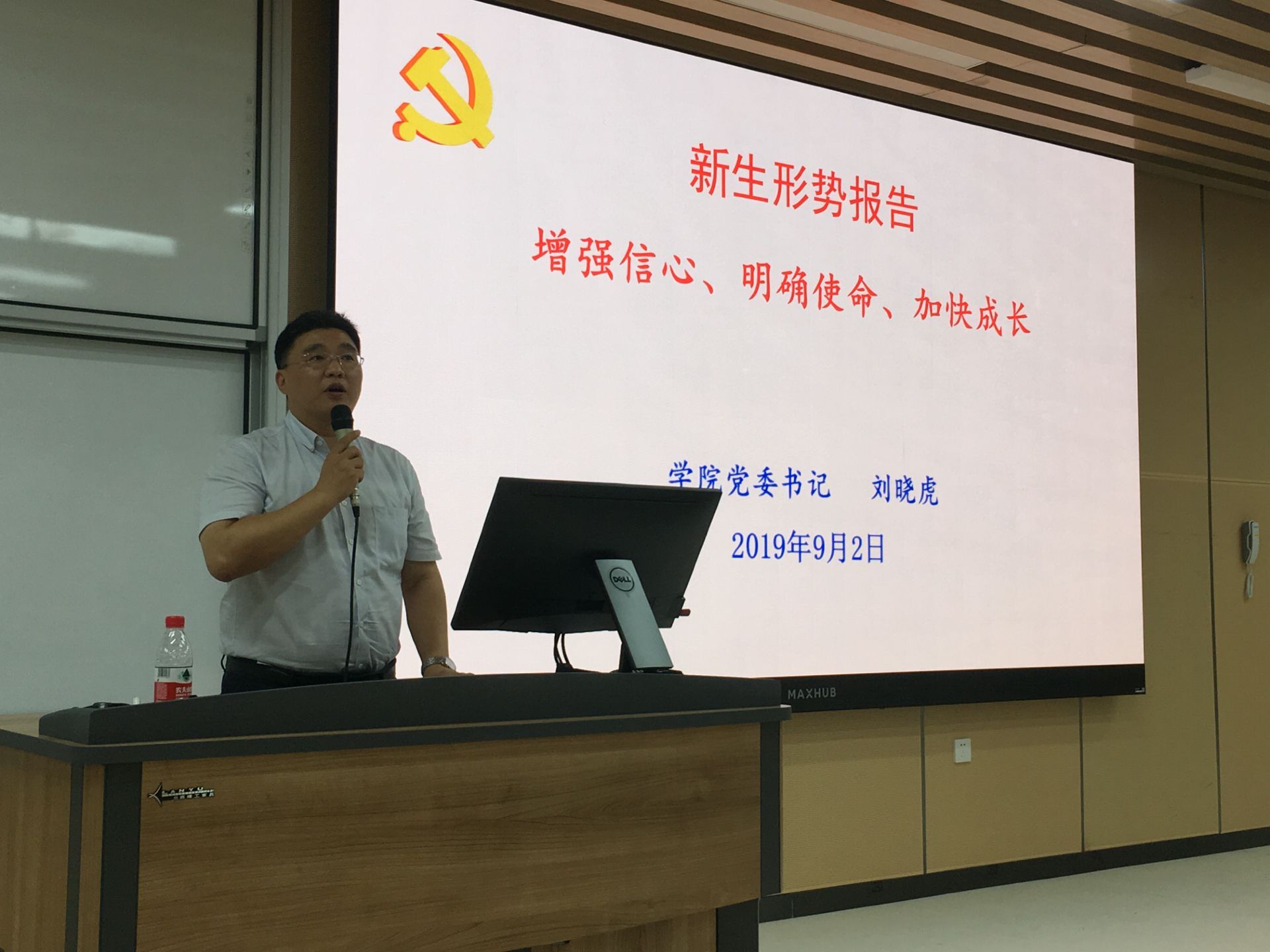 为贯彻中共中央、国务院《关于加强和改进新形势下高校思想政治工作的意见》(中发〔2016〕31号)文件精神,落实“学院党委书记、院长每学期至少分别为学生上1次思想政治理论课”的工作要求,2019年9月2日,伟德体育官网党委书记刘晓虎副教授深入本科生形势与政策课课堂,为2019级全体新生做了主题为“增强信心、明确使命、加快成长”的新生形势报告。学院党委冯国涛副书记,学生事务办公室主任、2019级辅导员贺婷老师、2019级兼职辅导员李佳丽老师,以及2019级全体新生聆听了本次报告。
