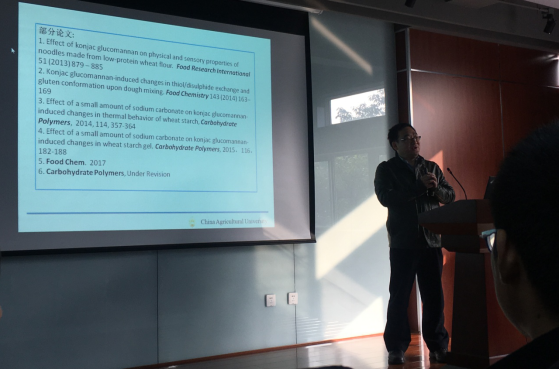 2017年12月4日上午9时,中国农业大学程永强教授来我院开展“魔芋葡甘露聚糖与面团各组分相互作用及对产品功能影响”学术报告,食品工程系何强教授、吕远平教授、迟原龙副教授、赵志峰副教授、卜迁副教授、钟凯博士、任尧博士等多名教师以及100余名研究生和本科同学参加。