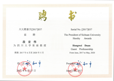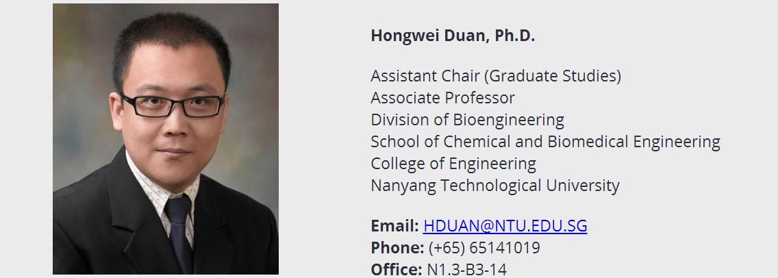 2017年7月4日,来自新加坡南洋理工大学化学与生物医学工程学院的段宏伟副教授对我院进行学术交流访问,并在皮革楼二楼报告厅做了学术报告会,报告会由我院林炜教授主持。段宏伟副教授在会上作了一场题为“The Power of Reactive Polymers in Nanochemistry”的学术报告,介绍了其主要的研究方向和最新的研究成果。该会不仅有我校大量教师、研究生、本科生参加,还吸引了部分校外的学者们前来交流讨论。最后,大家带着思考和收获,以热烈掌声感谢段宏伟副教授的精彩学术报告,报告会在轻松活跃的气氛中落下帷幕。段宏伟教授本科和硕士分别就读于复旦大学化学系和高分子系,师从江明院士。他于2005年在马克思普朗克胶体界面研究所Helmuth Möhwald教授研究组完成博士论文,之后在佐治亚理工和Emory大学生物医学工程系和聂书明教授从事博士后研究。他在2009年加入新加坡南洋理工大学化学与生物医学工程学院,并于2015年晋升终身副教授。2017年被聘为四川大学客座教授。目前他的研究内容主要集中在通过理解调控微纳结构的表面-界面性质实现相应材料在生物医学和环境工程领域的应用。