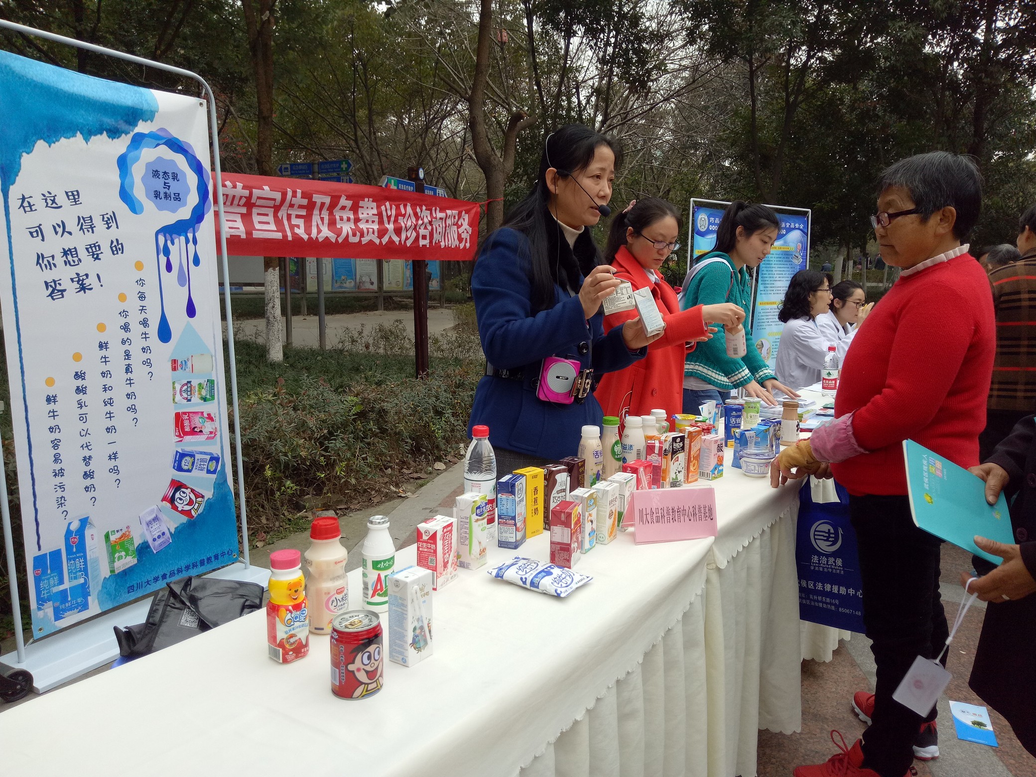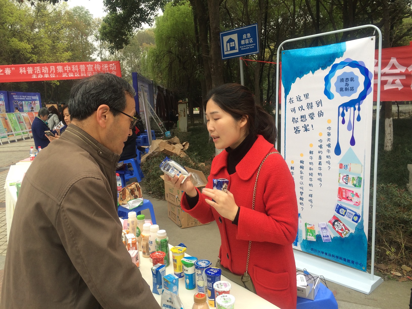2017年3月29日,武侯区第二十二届“科技之春”科普活动月集中科普宣传活动在簇桥街道簇锦公园进行,我院食品科学科普教育中心吕远平教授和何贵萍老师携带市面上各类液态乳(酸奶,纯牛奶,各种乳饮料等)参加了此次活动,为广大市民带来了一场关于“液态乳与乳制品选择”的知识盛宴。活动过程中,提醒市民可通过乳制品包装盒(袋)上的标签来区分乳制品种类和认识乳制品的营养成分等,打破了有些人认为某种乳制品好或不好“一刀切”的观念,让大家对乳制品的选择有了比较理性和客观的认识。