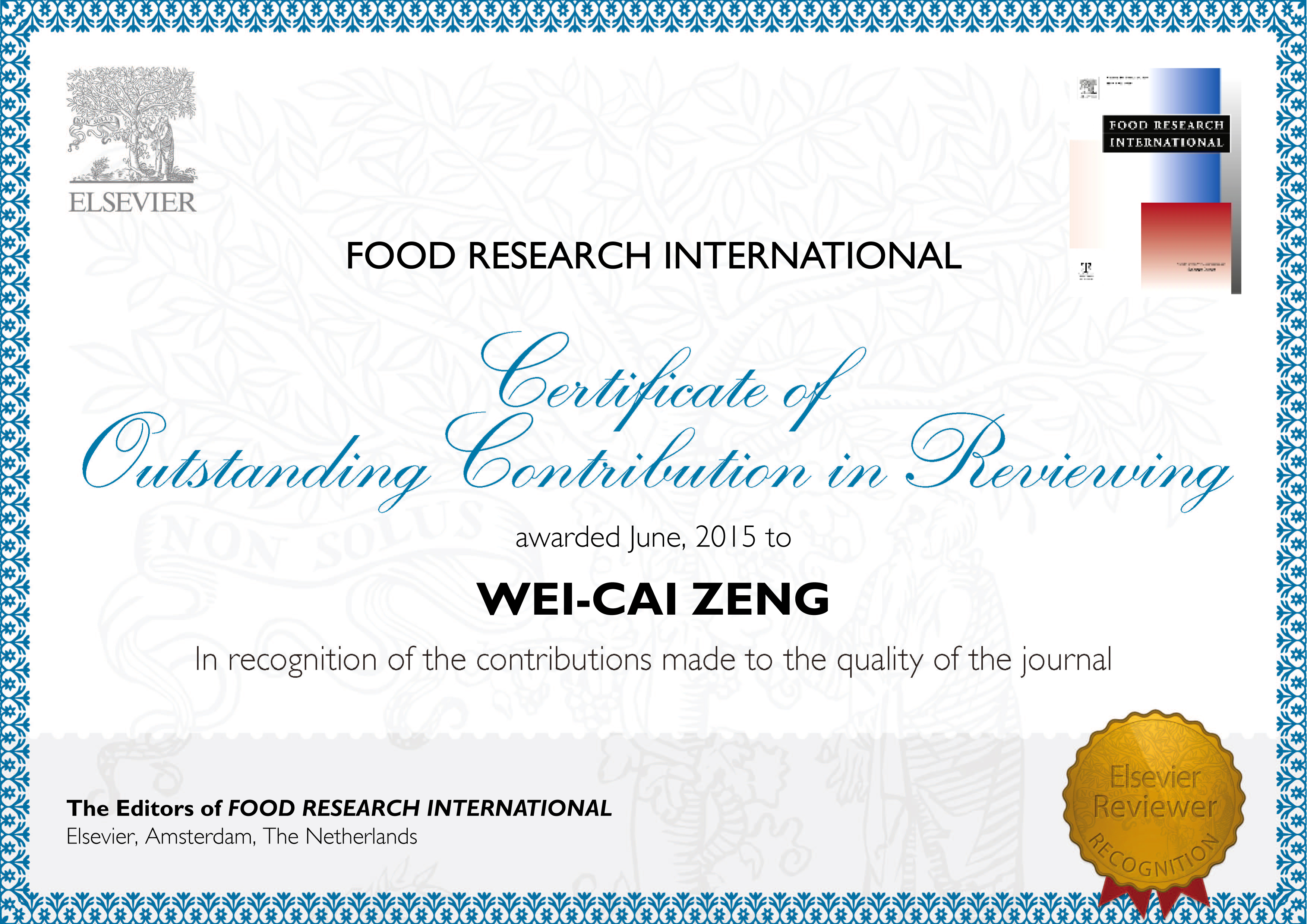 我院青年教师曾维才博士荣获由Elsevier出版社及食品类国际期刊《Food Research International》共同颁发的“2015年度杰出贡献奖”,这是我院在创新人才培养方面的可喜进展,也是我院在国际科学交流方面的优异成果。