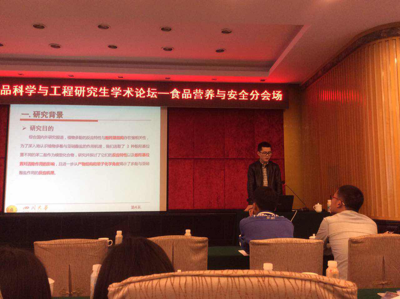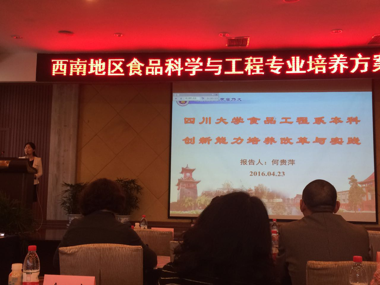 本次会议以“主题报告”、“专业培养方案交流与借鉴会”、“研究生学术论坛”三主题四会场的形式展开。23日上午开幕式结束后,何强教授首先就“食品科学中的植物多酚”进行了主题报告并简单介绍了我院学科团队建设及人才引进情况;下午,何贵萍老师从具体课程建设、新型教学体系构建、实验实践教学方法、教学管理、学生创新创业的培养等方面围绕着“食品科学与工程创新教育方案”主题进行了交流;而“研究生学术论坛”则围绕西南地区优势传统特色食品的工艺现代化,生产过程机理作用,食品安全评价及原料控制为重点进行讨论,我院也派出了学生代表卢云浩进行了“苯二酚对亚硝酸盐清除作用的比较研究”的学术报告。