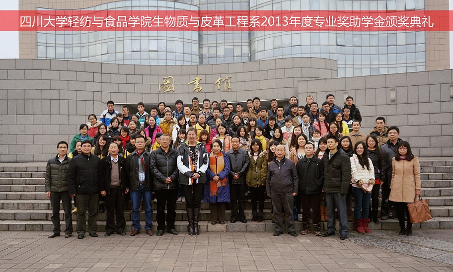2013年12月20日,中国皮革协会奖学金、斯塔尔奖学金、华南杰出奖助学金、科莱恩实习奖学金、广州绿北洋奖学金、欣驰—博奥奖学金、吴建军助学金颁奖典礼在江安校区综合楼C 407隆重举行。参加本次颁奖典礼的嘉宾有中国皮革协会名誉会长张淑华女士,四川省皮革协会理事长李开华先生,中国皮革协会张正洁女士,斯塔尔精细涂料(苏州)有限公司大中华区董事总经理安娜.泰温女士、人力资源部经理施勇先生、华南区销售经理徐建平先生,西部皮革杂志社副主编罗永娥女士。出席本次颁奖典礼的学院领导有四川大学轻纺与食品学院党委赵毅书记,院长、生物质与皮革工程系系主任何有节教授,党委副书记刘晓虎副教授,生物质与皮革工程系党支部书记程海明副教授,副系主任彭必雨教授,周华龙教授、陈意老师以及学生工作组老师。生物质与皮革工程系全体获奖学生及2012级、2013级生物质与皮革工程系本科生参与了本次典礼。颁奖典礼由彭必雨教授主持。