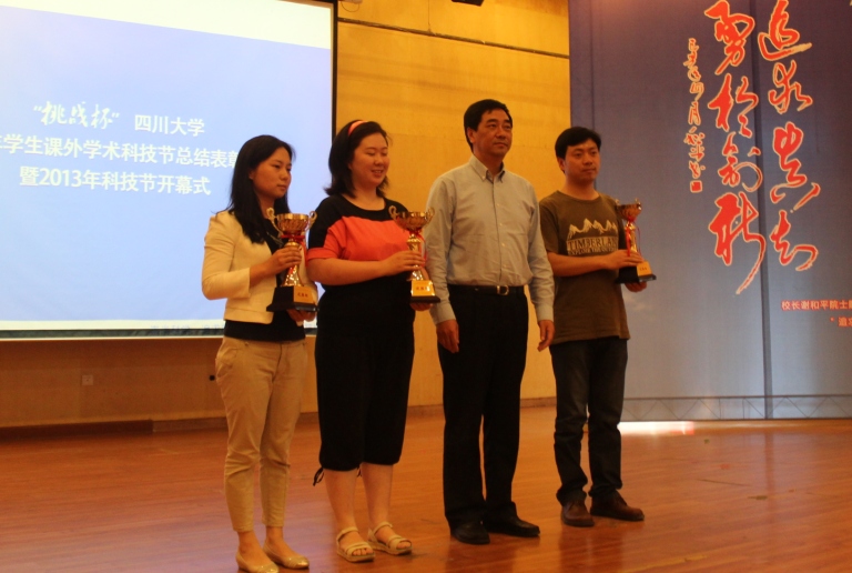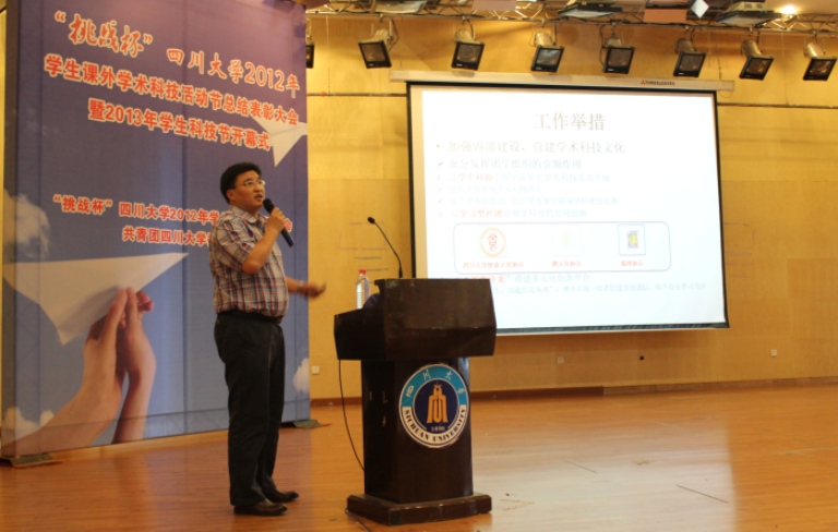 5月10日14:30,“挑战杯”四川大学2012年学生课外学术科技活动节总结表彰大会暨2013年学生科技节开幕式在望江校区文华活动中心二楼音乐厅举行。校长谢和平院士,常务副校长李光宪教授,党委副书记李向成教授等领导出席了本次会议。轻纺与食品学院在2012年学生科技节中以总分第六名的优异成绩喜获团体三等奖,院党委副书记刘晓虎副教授作为学院团体获奖代表做工作交流,院团委书记苏德强老师代表学院上台领奖。大会伊始,校团委书记王斌副教授介绍了2012年学生科技节的开展情况和所取得的丰硕成果,校党委副书记李向成教授宣读了《关于表彰在“挑战杯”四川大学2012年学生课外学术科技活动节中获奖集体和个人的决定》,随后学校领导为获奖集体颁发了奖杯,常委副校长李光宪教授宣读了《关于认真组织开展“挑战杯”四川大学2013年学生课外学术科技活动节的通知》。校长谢和平院士发表了题为《青年学子更有创新精神》的讲话。我院党委副书记刘晓虎副教授作为团体获奖代表在大会上进行了题为《立足院情、整合资源、创新平台,建设具有学院特色的学术科技文化》的工作汇报。刘书记从院情基础、工作思路、工作举措、工作效果、努力方向和工作体会等六个方面进行了交流,详细介绍了我院在营建学术科技文化、拓展外部资源、浓厚学院科技氛围的工作举措以及所取得的工作成效。一年来,我院广大学子在学院党政的关怀和指导下,在学院团委的统筹和组织下,在学院老师的辛勤教育和指导下,勤于思考,勇于实践,积极参加各类学术科技类活动。在本届科技节的各个项目中,我院学子获得一等奖二项,二等奖二项,三等奖五项,优胜奖三项。