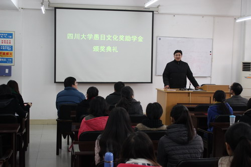 2012年12月28日中午1点,2012年度四川大学愚目文化奖助学金颁发仪式在食品工程系纺工楼202多媒体教室顺利举行,参加颁发仪式的有成都愚目文化传播公司周志明总经理,轻纺与食品学院副院长、食品工程系系主任何强教授,院党委副书记刘晓虎副教授,团委书记苏德强老师,2010级辅导员段飞霞老师,食品工程系邹华雄老师以及食品科学与工程专业全体获奖学生。颁奖典礼由院党委副书记刘晓虎主持。