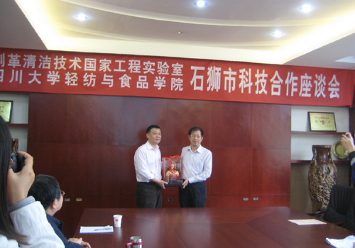 2012年10月29日下午,福建石狮市政府及企业家代表团访问我院、制革清洁技术国家工程实验室,校、地、企三方在我院皮革楼会议室进行了科技合作座谈会。来访的石狮市领导有:石狮市常委、组织部上官部长、组织部蔡副部长、石狮市科协何主席、石狮市院士工作站领导小组成员、福建冠兴皮革股份有限公司曾江勇副总经理等。 制革清洁技术国家工程实验室(四川大学)主任石碧院士、轻纺与食品学院赵毅书记、何有节院长、党办李慧主任、生物质与皮革工程系但卫华教授、皮革系办公室邱华军主任等参加了座谈会。 会议伊始,制革清洁技术国家工程实验室(四川大学)主任石碧院士向石狮市组织部上官部长一行访问我校表示热烈的欢迎,并介绍了工程实验室科研、技术创新、培养研究生等概况,对冠兴院士工作站的下一步工作做了重要指示。何有节院长代表学院对上官部长一行来访表示诚挚的欢迎,并介绍了轻纺与食品学院的历史沿革、办学规模、学科建设、师资力量、本科生和研究生教育、科研工作、技术转让、校友工作及国际合作等方面的概况。石狮市组织部上官部长代表石狮市感谢四川大学制革清洁技术国家工程实验室和轻纺与食品学院对石狮市工业和经济建设的支持,表示石狮市将进一步加强与工程实验室、学院的全方位合作。福建冠兴皮革股份有限公司曾江勇副总经理代表公司感谢轻纺与食品学院皮革学科的教授多年来在新技术、新工艺等方面对冠兴公司发展的支持,并介绍了院士工作站的工作进展。