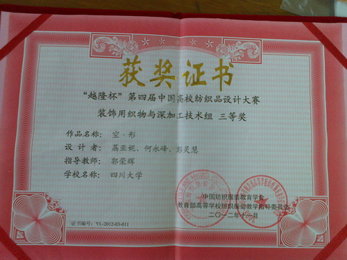 中国纺织服装教育学会主办的“越隆杯”第四届中国高校纺织品设计大赛11月30日圆满结束。大赛面向全国纺织类高校中征集参赛作品,来自东华大学、天津工业大学、浙江理工大学等全国22所相关高校纺织类专业的学生参赛,共征集608件作品,经过由组委会严格筛选,其中33件作品入围决赛,我院纺织工程专业荔亚妮等同学(指导老师:郭荣辉)的作品《空﹒行》获得装饰用织物与深加工技术组“三等奖”,郭荣辉老师在此次大赛中获得“优秀指导教师”称号。