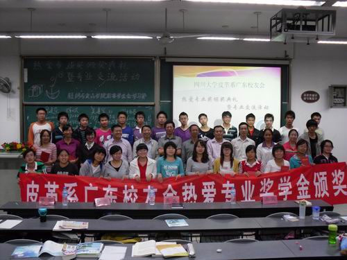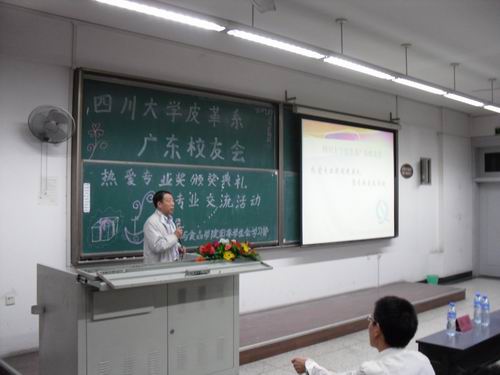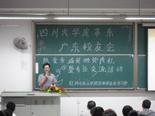 2010年9月28日晚19:30,四川大学皮革系广东校友会热爱专业奖颁奖典礼在江安一教B204隆重举行。参加本次颁奖典礼的有皮革系广东校友会会长、皮革系84级校友周阳春先生;皮革系广东校友会常务副会长、皮革系91级校友倪建荣先生;皮革系广东校友会副会长、皮革系83级校友吴建军先生;皮革系广东校友会副会长、皮革系91级校友陈斌先生;轻纺与食品学院院长、生物质与皮革工程系系主任陈武勇教授。颁奖典礼由冯国涛老师主持。 首先陈院长代表轻纺与食品学院生物质与皮革工程系对广东校友会的四位校友回到母校表示热烈的欢迎,对广东校友会在我校设立奖学金表示忠心的感谢,对获奖同学表示诚挚的祝贺。同时,陈院长详细的介绍了生物质与皮革工程系近几年的发展与取得的新成就,这些成绩的取得离不开全系师生的共同努力,更离不开校友们的大力支持与协助。同时,广东校友会在得知近年来我校第一志愿报考人数逐渐增多的情况下,当场表示追加奖金,让所有热爱本行业的同学都能享受到家庭般的温暖。陈院长也鼓励在座所有同学,在未来的学习、工作中,认真学习,踏实工作,以自身优异的学习与工作表现来回报行业。随后,周会长介绍了设立此奖学金的初衷,中国正处于皮革生产大国,对技术人员的需求非常大,希望以此来为行业培养更多优秀的人才。同时,周会长也对所有获奖同学表示了祝贺。与会的嘉宾与学院领导一起为获得2010年四川大学皮革系广东校友会热爱专业奖的34名同学颁发了荣誉证书。最后,2010级本科生代表郭东贤同学作了发言,她首先感谢广东校友会在我校设立奖学金,让更多热爱行业的同学受到奖励,并表示在以后的学习、工作中决不辜负期望,倍加努力。 颁奖典礼结束之后,四位校友还分别从个人的成长历程与创业之路为同学们讲解了自己的经验,并对皮革行业的现状与人才需求作了详细的介绍。随后,还针对同学们提出的问题进行了一一解答。 四川大学轻纺与食品学院2010年10月8日