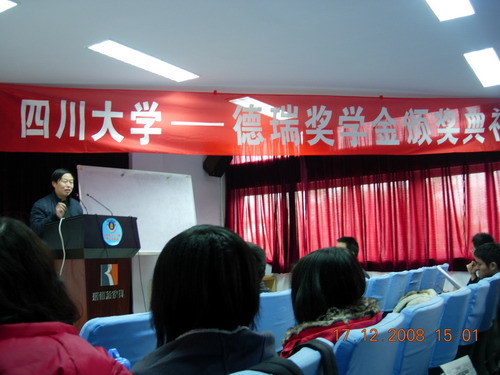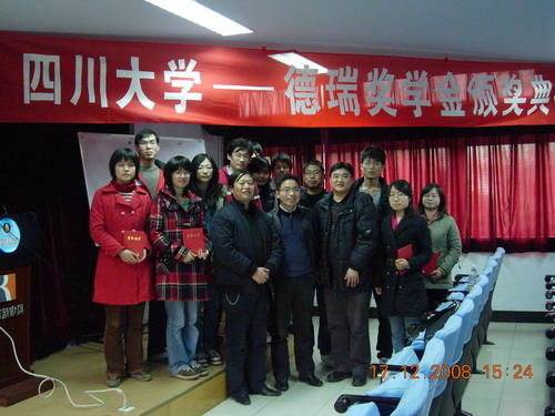 2008年12月17日下午14:30,德瑞皮革科技奖学金颁奖典礼在皮革楼报告厅隆重举行。参加本次颁奖典礼的嘉宾有德瑞皮革科技有限公司华中区经理、皮革系93级校友姚兵先生;轻纺与食品学院副院长何有节教授;轻纺与食品学院党委副书记刘晓虎副教授及2005级本科生、专业生、研究生参加同学。颁奖典礼由冯国涛老师主持。 颁奖典礼开始时,何有节教授首先代表学院致辞,对德瑞皮革科技有限公司长期以来对四川大学的支持与关注,在我校设立奖学金表示衷心的感谢,对我校杰出校友能在百忙之中回到母校表示热烈的欢迎,并期望与同学们有深入细致的交流。随后,姚兵先生代表德瑞皮革科技有限公司对本次获得奖学金的同学表示祝贺,并勉励大家以此为新的起点,争取明年取得更加优异的成绩。刘晓虎副教授宣布了获奖名单,并与姚兵先生、何院长一起为优秀研究生、优秀本科生、优秀专科生同学颁发了证书。最后,获奖同学代表2005级轻化工程专业顾庆圆同学作了发言,他首先是对设奖单位表示感谢,并表示在以后的学习中,定将倍加努力,不辜负老师、企业的一片期望。颁奖典礼结束后,姚兵先生还与同学进行了深入的交流与互动,就同学们所关心的金融危机对行业的影响,职业生涯规划以及女同学就业等问题进行了细致的交流,并获得了同学们的阵阵掌声。(billows)生物质与皮革工程系2008年12月17日