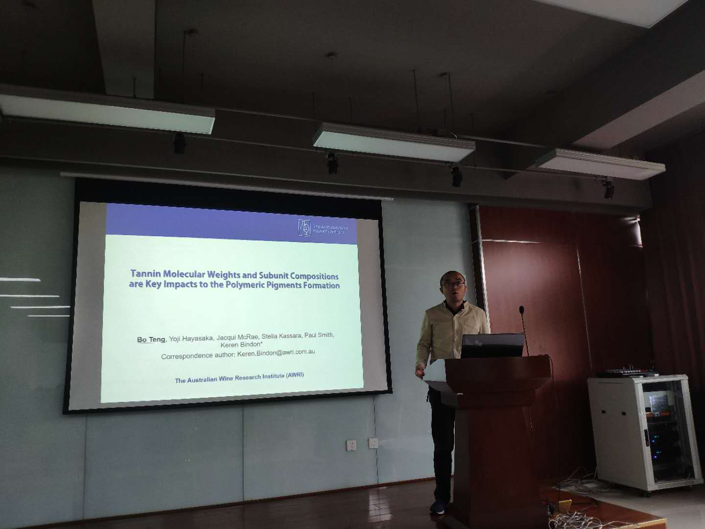 本次讲座滕博副教授以单宁与花色苷反应对对葡萄酒颜色的影响为主要研究目的,采用从葡萄皮和葡萄籽中分离纯化得到的不同分子量大小的单宁,在各种模拟葡萄酒环境中考察了不同单宁与花色苷的反应动力学、产物组成和结构以及对酒品品质的影响。滕博副教授的报告涉及单宁的分离纯化以及组成和结构分析,进一步拓展了我院师生在植物单宁领域的研究思路和方法,引起了与会师生的浓厚兴趣。同时滕博副教授还就葡萄酒酿造、品鉴等内容进行了深入浅出的报告。