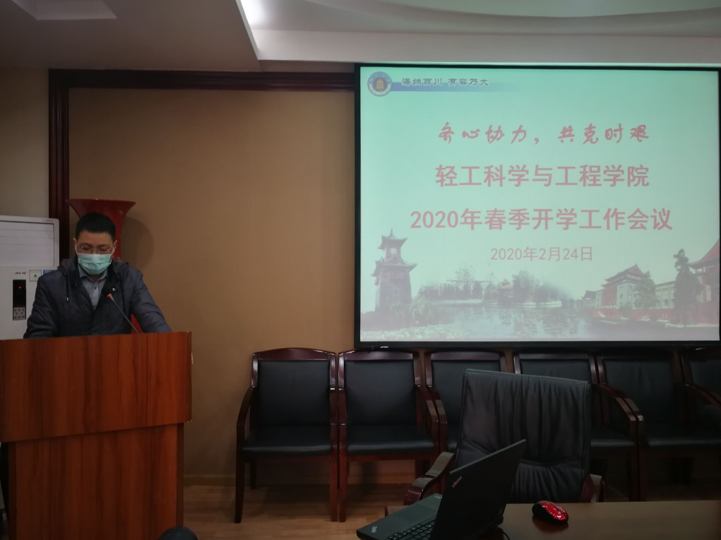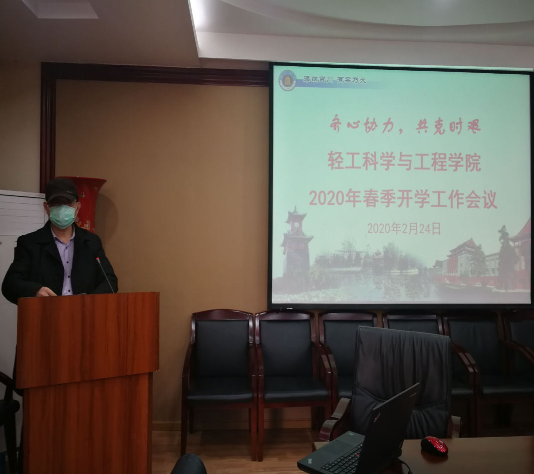 何有节院长围绕学校的指导精神,从全面组织做好第五轮学科评估工作和“先进轻工技术与环境保护”一流学科群验收的收官工作,对本年度工作进行部署。提出在新冠肺炎防控的非常时期,希望全院教职工团结一心,共克时艰。