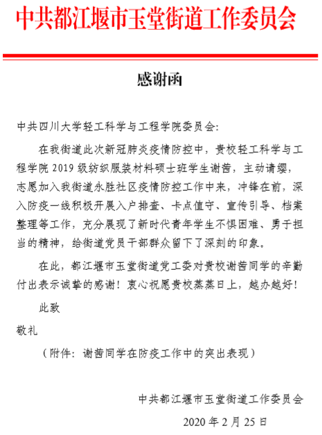 【街道办写给我院学生的感谢信】