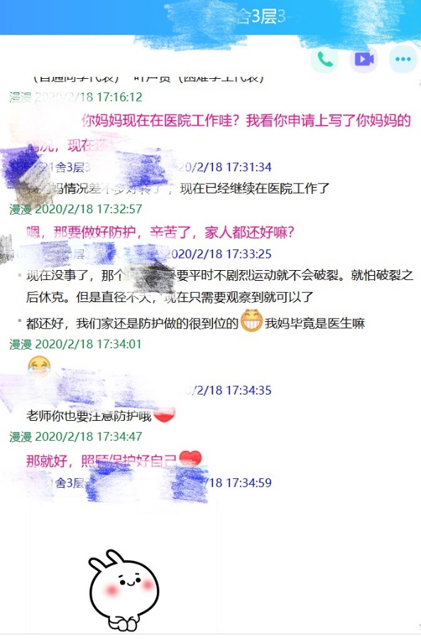 当疫情来临时,学院学生事务办公室全体老师立即启动全院学生的摸排工作,重点对武汉籍、湖北籍学生的家庭情况、健康状况进行了全面了解,并制定了“一对一”关爱帮扶行动方案。疫情期间,各年级辅导员对学生情况通过每日健康打卡进行了动态跟踪,并及时向学生传达了相关通知要求以及防疫知识、心理健康、学习指南等,让全体同学情绪稳定,理性对待疫情,以积极态度配合学校、当地政府工作,助力打赢疫情防控阻击战。