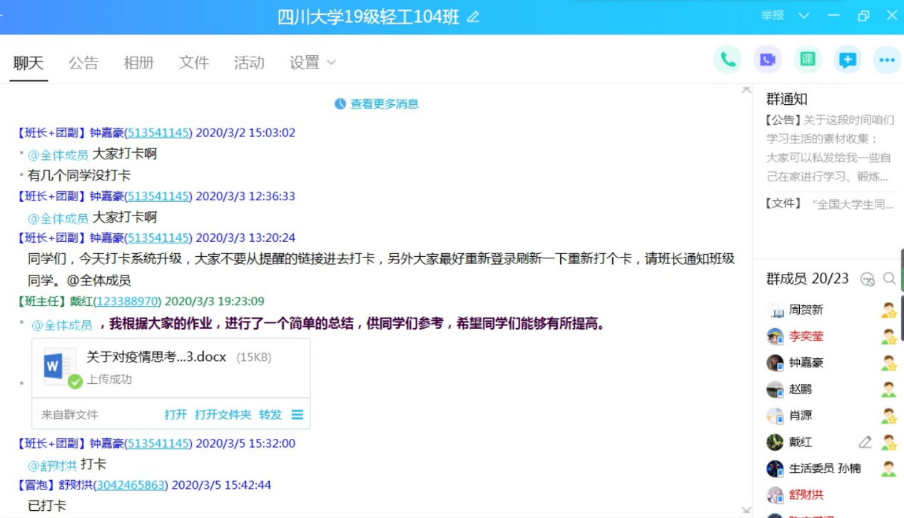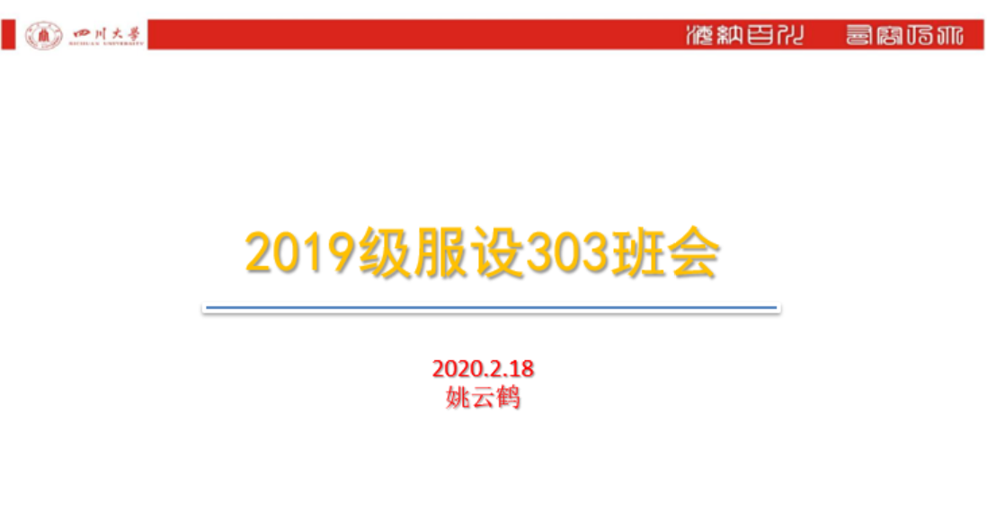 2020年2月18日,姚老师决定在腾讯会议平台召开线上班会,一方面提醒大家继续做好防护,准备好开学后的线上学习,另一方面也在盼着他们都平平安安、健健康康地回来。此刻,姚老师最想给学生说的话:孩儿们,川大见!