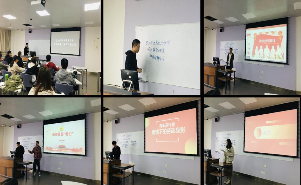 申润一同学以“青年逆行者——疫情下劳动身影”为题代表第四小组做主题发言,首先向同学们介绍“中国青年志愿者协会”机构概况,并分享了青年志愿者誓词,还通过视频播放了志愿者代表如“守门员”、“协管员”、“运输员”等普通群体在疫情期间壮举,让同学们深刻认识到志愿者们伟大,同时也激励自己成长,在未来的日子里以更加青春昂扬的姿态在实践工作中增长本领。最后,李柯莹同学以精彩演讲将班会活动推向高潮,倡议全体同学将劳动奉献精神牢记心中,在校期间努力学好本领、练就过硬专业基础,感恩社会回报社会,成就自我价值。