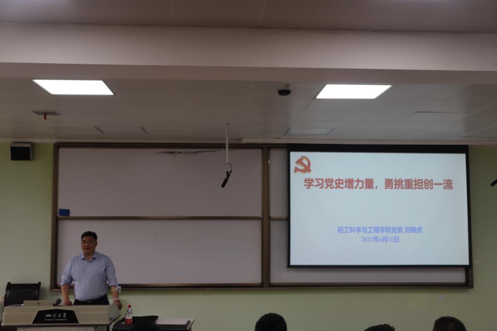 为深入推进党史学习教育走深走实,以更加高昂的状态迎接中国共产党建党100周年,2021年6月11日下午,学院党委刘晓虎书记在四川大学江安校区第一教学楼B103教室为2020级本科生作党史学习教育专题辅导报告。本次辅导报告由2020级辅导员余昕玲老师主持。刘晓虎书记以“学习党史增力量,勇挑重担创一流”为主题,从“中国共产党为什么能”、“马克思主义为什么行”、“中国特色社会主义为什么好”、“学习党史应该获得的力量”四个部分进行重点讲授。