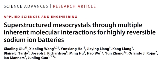 近日,我院郭俊凌教授团队与我校材料科学与工程学院吴昊教授、张云教授团队合作,以植物多酚基础结构单元为核心材料,利用植物多酚天然的物理化学性质,构建了类蛋白类核酸界晶超结构,相关研究成果以我院为第一单位作为在线封面论文发表在国际顶级期刊《Science Advances》上,题为“Superstructured mesocrystals through multiple inherent molecular interactions for highly reversible sodium ion batteries”。我院王晓玲(副研究员,专职科研)、何云翔(助理研究员)、我校材料学院2018级硕士研究生邱小玲为共同一作,吴昊教授,张云教授和郭俊凌教授为该论文的共同通讯作者。加拿大英属哥伦比亚大学Orlando J. Rojas教授,维多利亚大学Ian Manners教授等国际著名学者也参与了部分工作。该项目获得了国家自然科学基金委、国家“双一流”重点学科建设经费,制革清洁技术国家工程研究中心、高分子材料工程国家重点实验室、国家博士后基金、四川省博士后研发基金等的支持。
