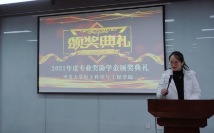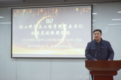 接下来,学院党委书记刘晓虎副教授宣读了《关于表彰伟德体育官网2021年度优秀个人、优秀班级的决定》。在隆重的颁奖音乐中,学院领导为获奖同学代表一一颁奖并合影留念。最后,2019级轻化工程专业创新班学生孙楠同学代表获奖学生发言,他表示在学习阶段对皮革专业了解越多,热爱越深,学院提供了优秀教师资源与超一流实验室,而学生要做的就是把握机会,在入学的这3年里他找到了自己的科研方向、制定了清晰的计划。同时,他也表达了对设奖单位的感谢,对学院老师们的谆谆教导表示谢意。最后他感悟到现如今多学科交叉是大学期间综合能力提升的必然趋势,应积极拓展自我视野和知识面,而学习之路没有捷径,继续深造应是作为川大本科毕业生的首要选择,也是自我前进路上的风景!