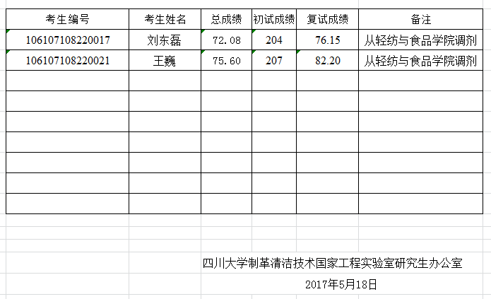 现将制革清洁技术国家工程实验室2017年博士研究生招生入学成绩进行公示。如有问题或意见,自公示之日起十个工作日内,实名制反映至轻纺与食品学院纪委办公室。邮箱lxhqf@scu.edu.cn,联系电话85461730。此名单不包括非公开招考考生。