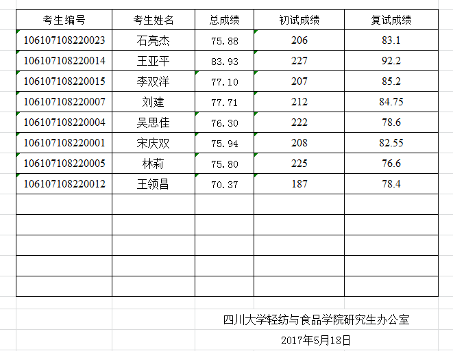 现将轻纺与食品学院2017年博士研究生招生入学成绩进行公示。如有问题或意见,自公示之日起十个工作日内,实名制反映至轻纺与食品学院纪委办公室。邮箱lxhqf@scu.edu.cn,联系电话85461730。此名单不包括非公开招考考生。