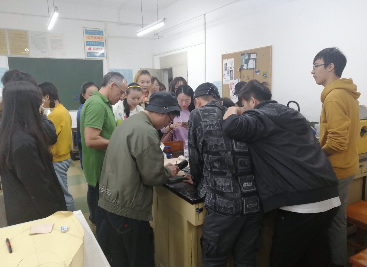 在服装教研室的邀请下,朱得安于10月21日下午3点半来到我校与赵武、冯洁、徐波、曾琦等师生交流。首先在皮革楼209进行座谈,然后在生物质与皮革工程系张金伟老师陪同下参观了皮革楼实验室,对皮革材料的工艺进行了交流。4点半来到了纺工楼5楼服装专业的服饰配件实验室与服装专业的同学们进行了深入的交流,对同学们的皮包设计图的结构、材料的选用及设计与制作构想进行了探讨,将随身背包的设计与制作理念介绍给大家,包括对于负重的背包选用皮材的特点,装钉的位置等。大家对背包上的亮点---刻花非常欣赏,就此刻花的方法展开了探讨,朱利安从背包里拿出专门带来的皮革制作工具、环保的皮革样片演示起制作方法。 从他的熟练、专注与确定的刻花落点、花型的转换,师生们感受到了皮革刻花的上佳制作技艺是怎样的场景。亲自示范之后,邀请大家都来尝试体验皮上刻花,同学们上手很快就成了专注的皮革手艺人。朱利安现场制作的图案造型组合出有序的线条美,让我们切身见证了非遗传承---皮革制品的手工雕刻之美。