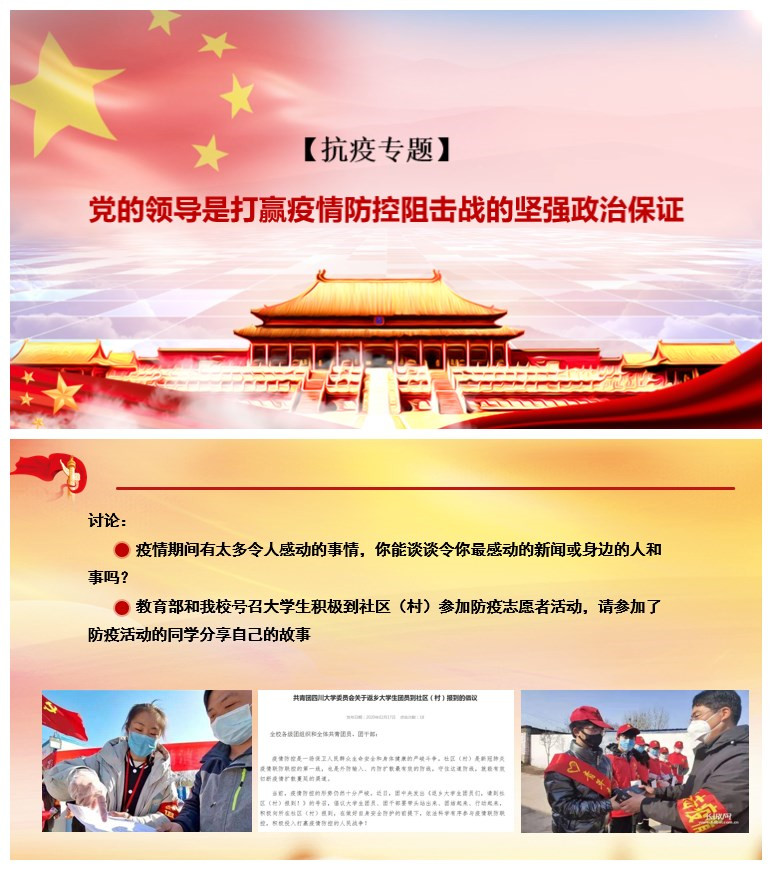 结合2020年疫情防控的特殊背景与学院疫情防控的实际情况,本次课程加入了抗疫主题内容——党的领导是打赢疫情防控阻击战的坚强政治保证。主题讲解中邀请武汉同学分享疫情期间的亲身体验和感触,并引入在线同学的讨论,意在让同学们更为直观的了解疫情,特别是处在疫情暴风眼的武汉的情况,从而从党的领导、社会治理、民生、人性等多方面去看待疫情。